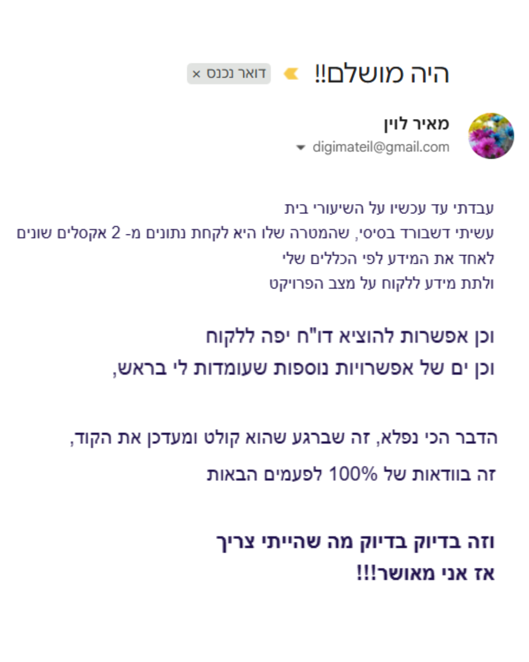 אני רוצה לקחת רגע ולפרגן מכל הלב לרני יפרח. לפני שהכרתי את רני, עולם הבינה המלאכותית נראה לי רחוק ומסובך. הגעתי בלי שום ידע, אבל השיטה של רני פשוט עובדת... מעבר למקצועיות, מה שבאמת תפס אותי זה הלב. רני נותן תחושה שההצלחה של התלמידים היא המטרה האישית שלו. הוא זמין לשאלות, נותן הכוונה מדויקת והופך כל שיעור לחוויה. בזכות הליווי הזה, לא רק שלמדתי את הבסיס, אלא התקדמתי לקורס מתקדם שבו בניתי בעצמי אפליקציות ווב ו'מיני סוכנים' אוטומטיים! דברו עם רני. ההמלצה הזו נכתבת מניסיון אישי והערכה גדולה.